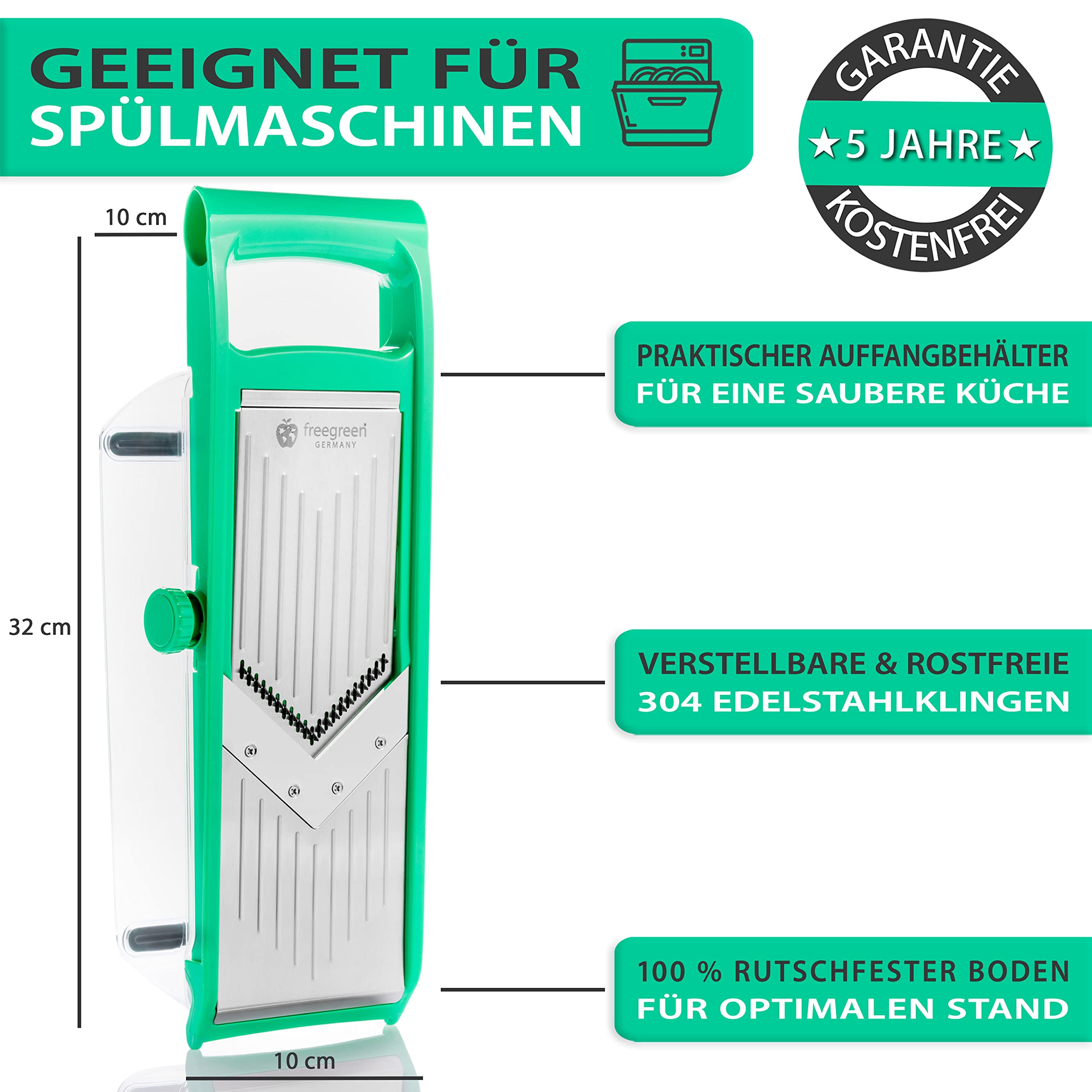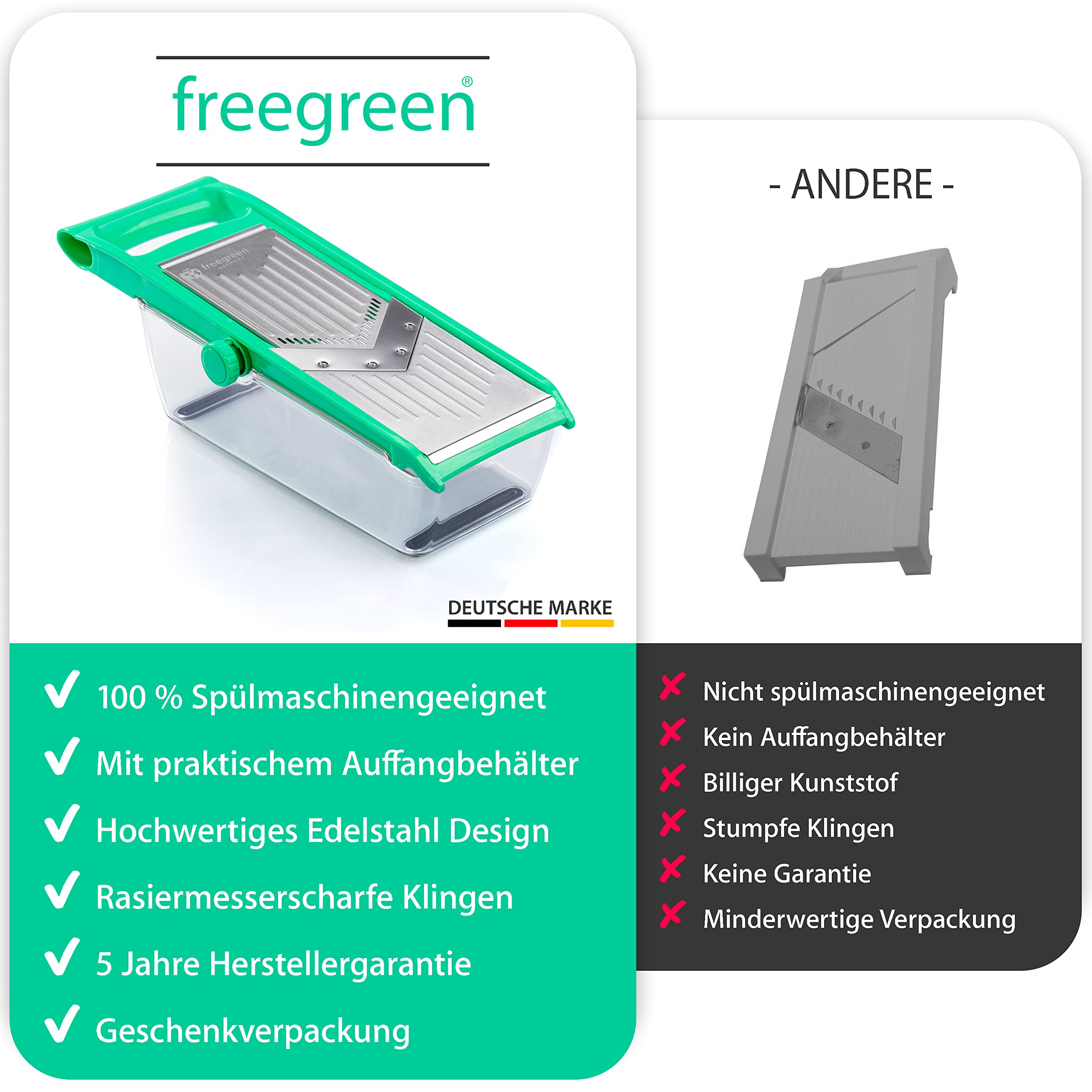 freegreen® GERMANY Obst- & Gemüsehobel aus Edelstahl mit V-Klinge & Auffangbehälter I Inklusive Gemüsehalter für perfekte Obst- & Gemüsescheiben sowie Juliennestreifen