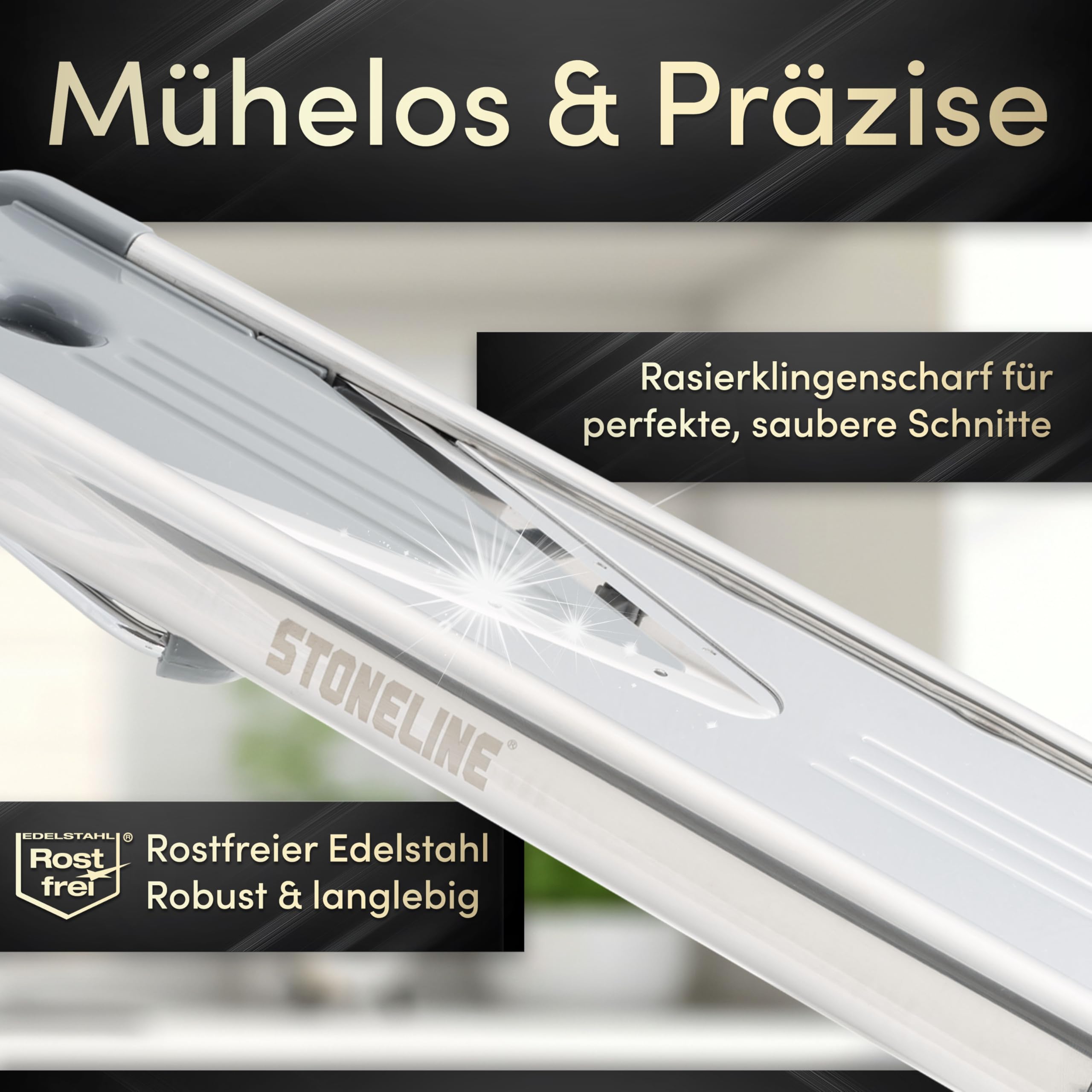 • 🥕 Lieferumfang: 1 x STONELINE V-Hobel, 39,5 x 13,1 cm; 1 x Klingenschutz, 5 x Schneideinsätze, 1 x Fingerschutz Halter, 1 x Aufbewahrungsständer für Schneideinsätze; Material: Edelstahl